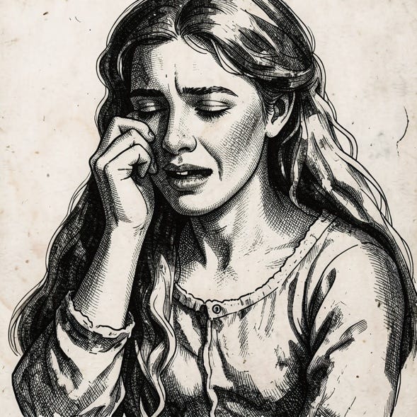Great sorrow came upon her, and it propelled her further into the dark forest. She ran and ran until she could run no more and eventually toppled, exhausted, onto the ground under an old oak tree. While resting, she saw in the distance a maiden with hair as red as ripe cherries. She was sitting on a tree stump, and she was sobbing.